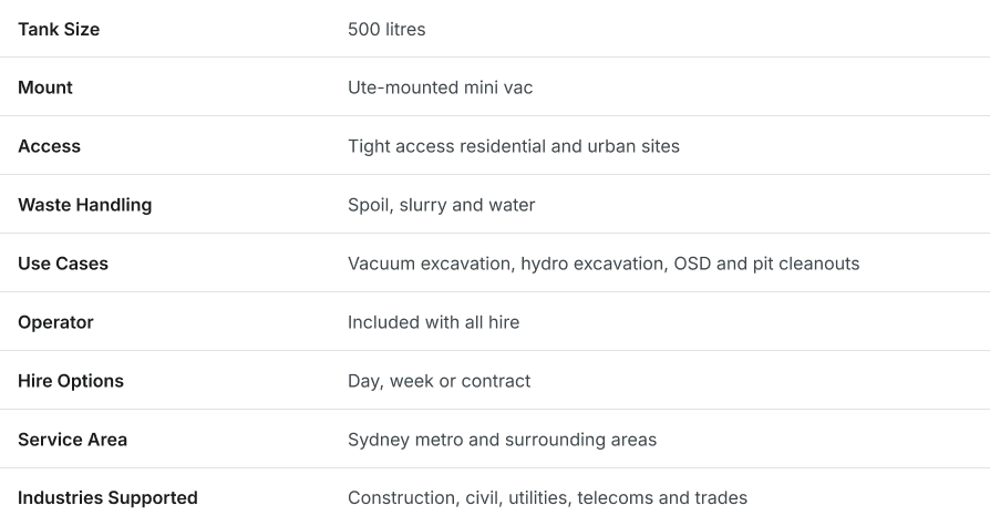 We invested in a 500L ute-mounted mini vac that responds quickly, accesses tight spots and completes smaller jobs efficiently — with the same safety standards expected on any professional Sydney site. The operator is experienced in telecommunications and civil construction, understands live services, and works with your team to get the outcome rather than just tick a box.